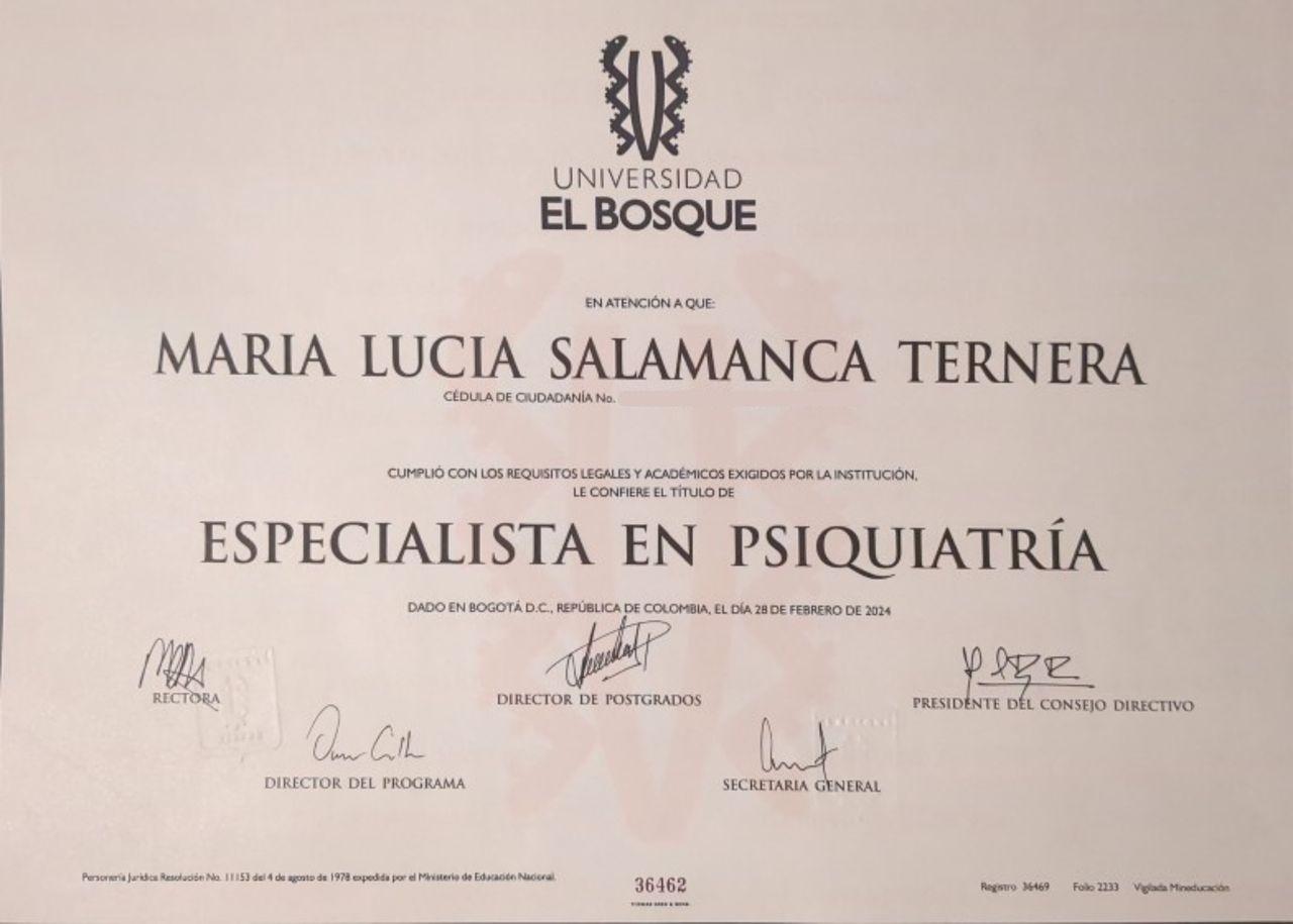 Psiquiatra de la Universidad El Bosque - ICSN con enfoque psicoterapéutico.